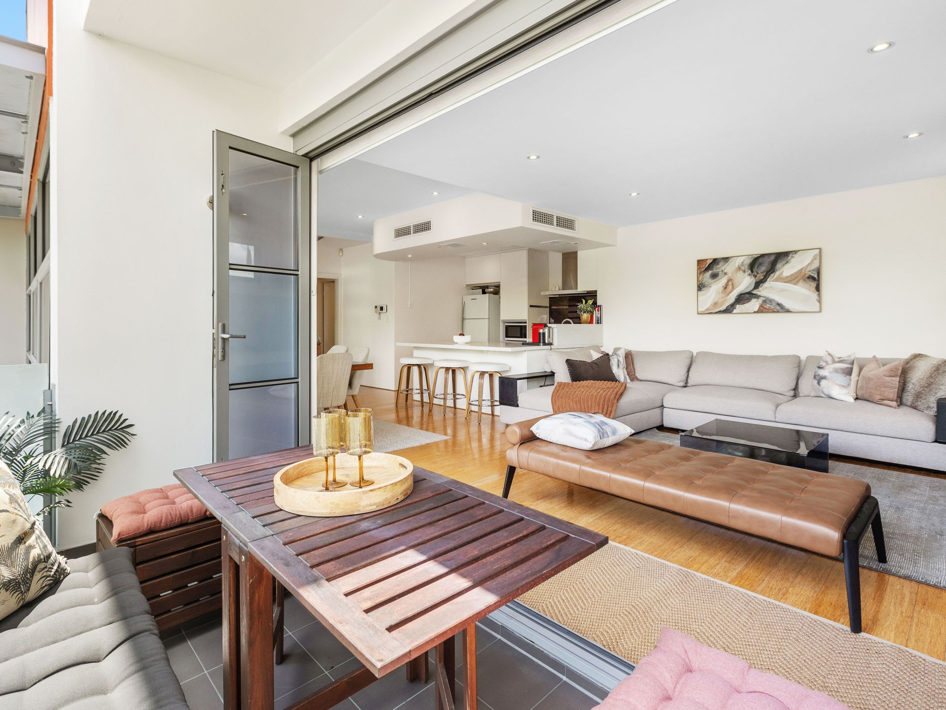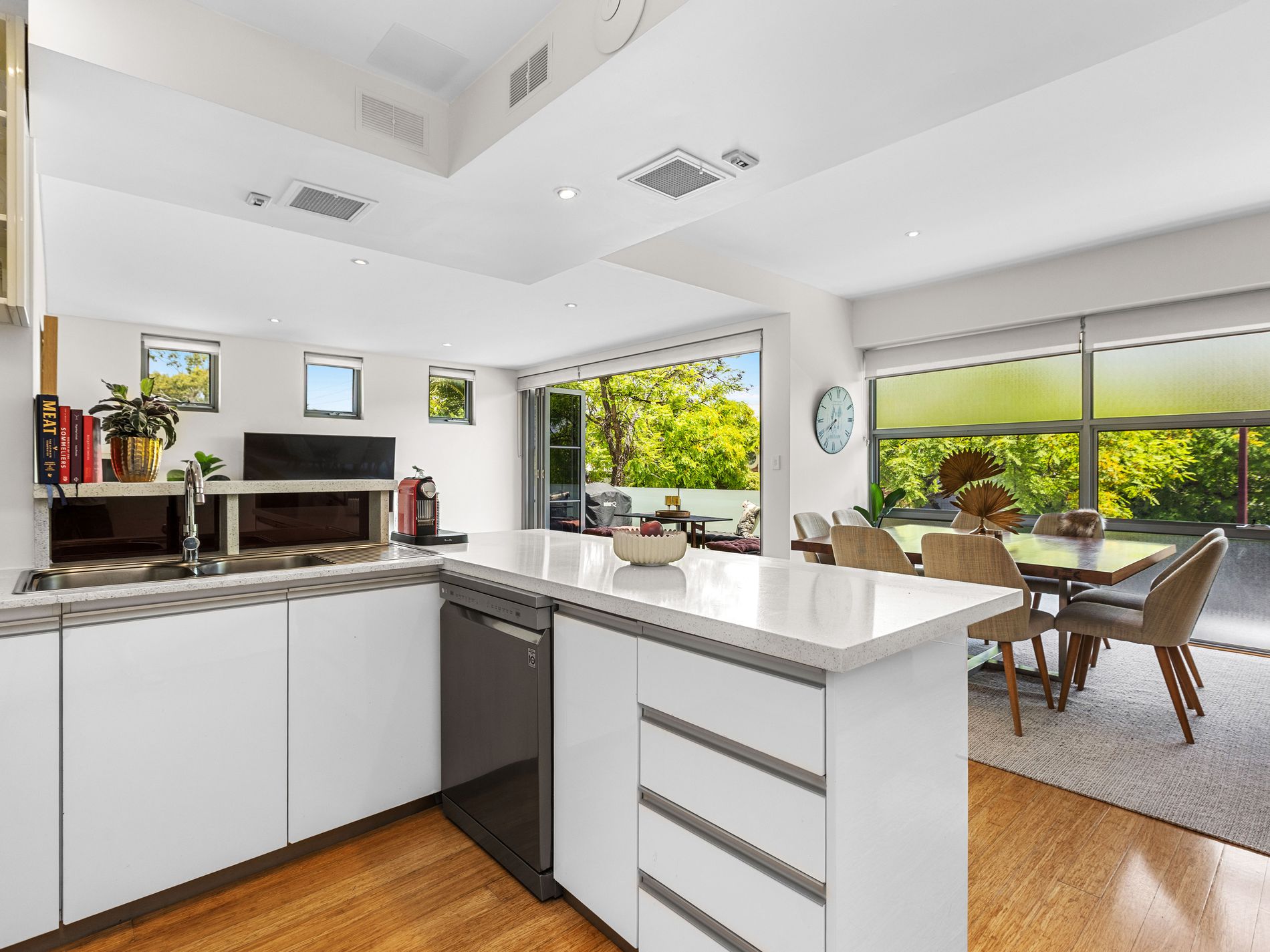 Welcomes natural light throughout the open plan living and dining area. Bi fold doors open to a balcony overlooking the leafy streetscape, creating an uplifting indoor–outdoor flow.